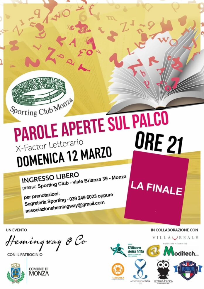 Riceviamo e pubblichiamo – Domenica 12 marzo si svolgerΓ lβattesissima finale di Parole Aperte X-Factor letterario presso lo Sporting Club di Monza. Giunto alla sua sesta edizione, Parole Aperte Γ¨ una manifestazione culturale che ha lo scopo di trovare e scovare nuovi talenti letterari sul territorio ideata e organizzata dall’associazione culturale Hemingway & Co e condotta dal suo presidente e giornalista Dario Lessa. Sapremo chi sarΓ il vincitore della sesta edizione che si porterΓ a casa un contratto editoriale e pubblicherΓ il suo libro.