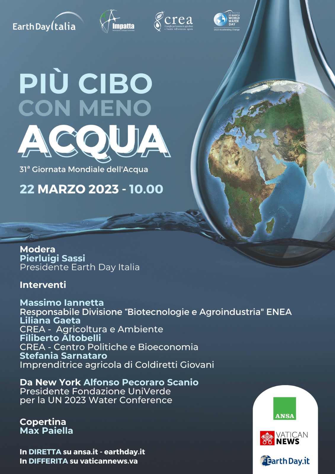 In occasione della 31a Giornata Mondiale dell’Acqua, a poche ore dall’apertura della UN 2023 Water Conference di New YorkEarth Day Italia in collaborazione con Impatta e il CREA, il più importante ente italiano di ricerca dedicato all’agroalimentare, organizza un digital talk in diretta ANSA dal titolo “Più cibo con meno acqua”, dalle ore 10.