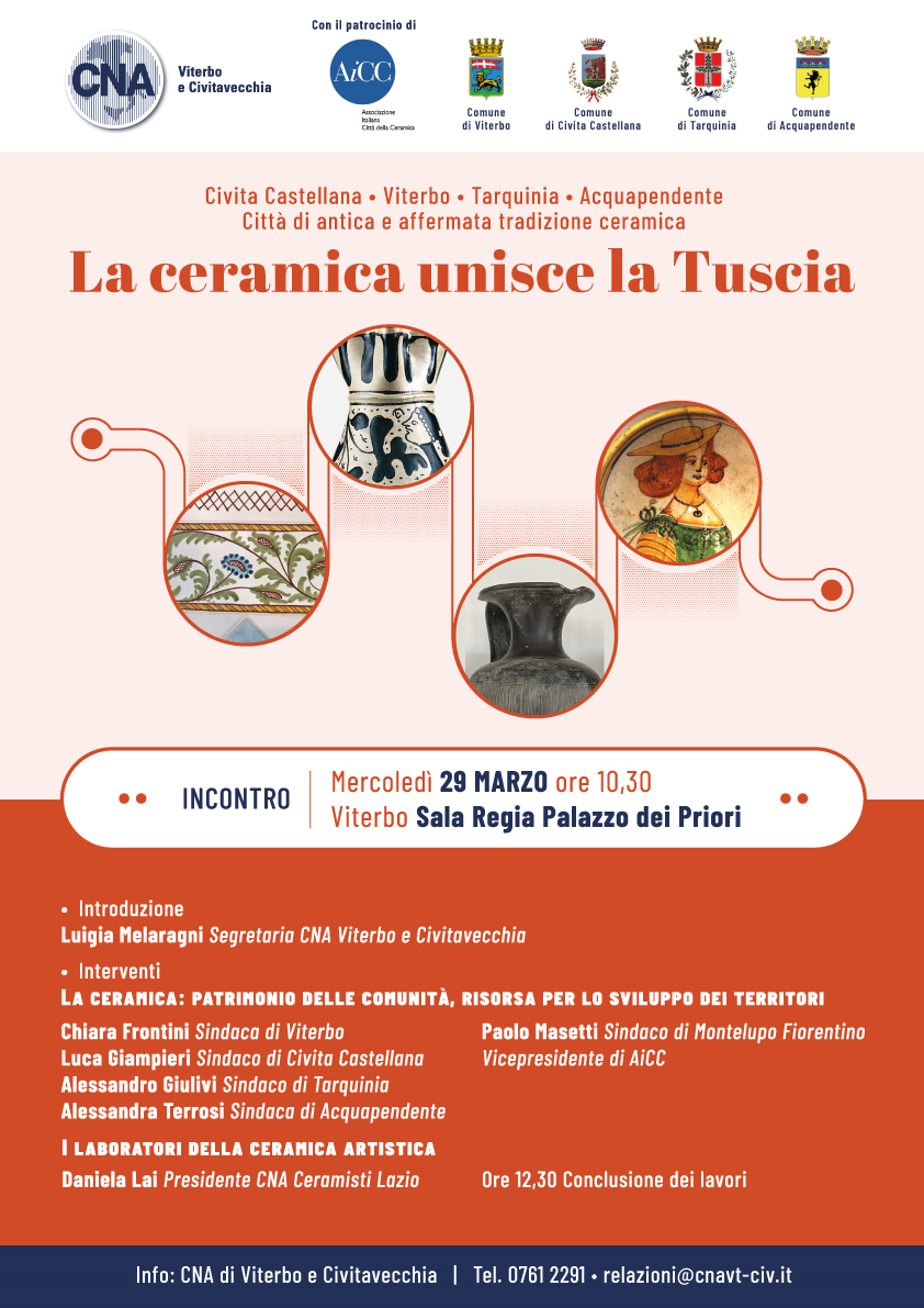 Civita Castellana, Viterbo, Tarquinia e Acquapendente: mercoledì 29 marzo, alle 10,30 nella Sala Regia di Palazzo dei Priori, saranno le protagoniste dell’incontro promosso dalla CNA di Viterbo e Civitavecchia sul tema “La ceramica unisce la Tuscia”.