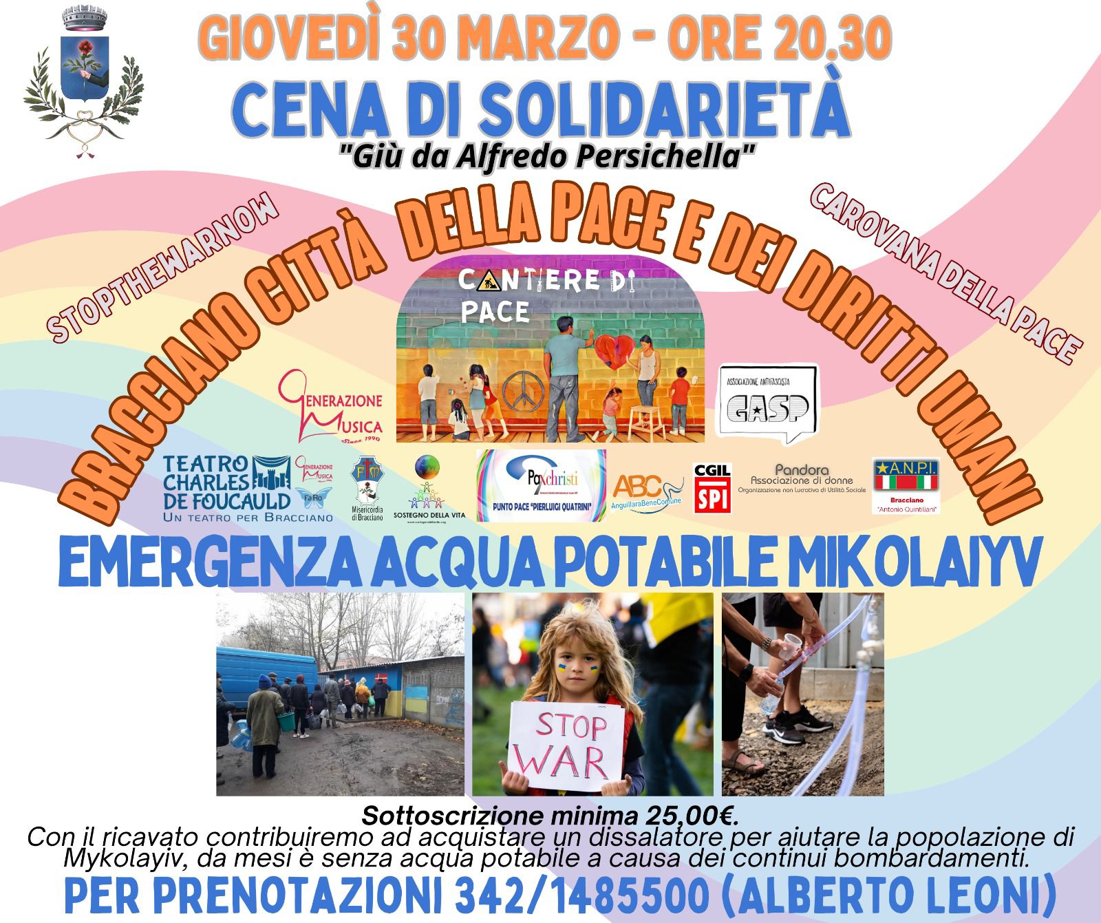 Il 30 marzo alle 20.30 ci sarà una cena di solidarietà “Da Alfredo- Persichella”, nell’ambito delle iniziative organizzate dal Cantiere di Pace costituito a Bracciano, per raccogliere fondi a sostegno della popolazione ucraina di Mikolaiyv, da mesi senza acqua a causa dei bombardamenti.