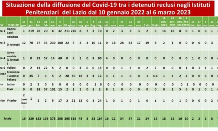 Lunedì 20 marzo ci sono sette persone positive al virus nei 14 istituti penitenziari del Lazio (5.671 persone detenute al 31/1/2023). Lo comunica la Direzione regionale salute e integrazione sociosanitaria – Area rete integrata del territorio della Regione Lazio agli uffici del Garante delle persone detenute. Quattro persone positive al virus sono nella Casa circondariale di Civitavecchia, due a Regina Coeli, una nel carcere femminile di Rebibbia.