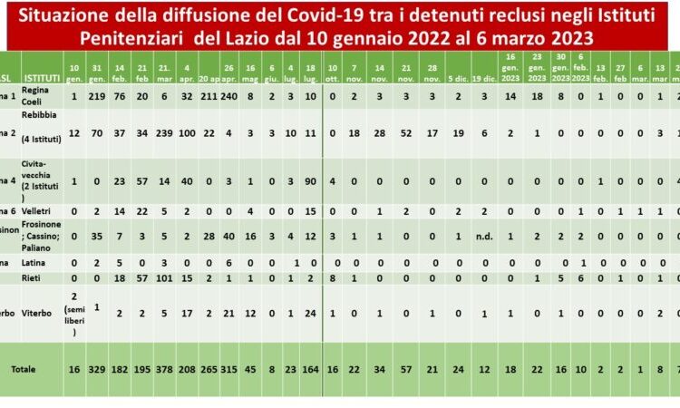 Nel sito del ministero della Giustizia è riportato il dato nazionale relativo a martedì 14 marzo 2023 : tra le 55.940 persone detenute presenti negli istituti penitenziari italiani, risultavano 16 persone positive. 113.393 le dosi di vaccino somministrate complessivamente. Nello stesso giorno erano 35 le persone positive tra il personale (36.939 unità di Polizia penitenziaria e 4.021 unità di personale amministrativo e dirigenziale).