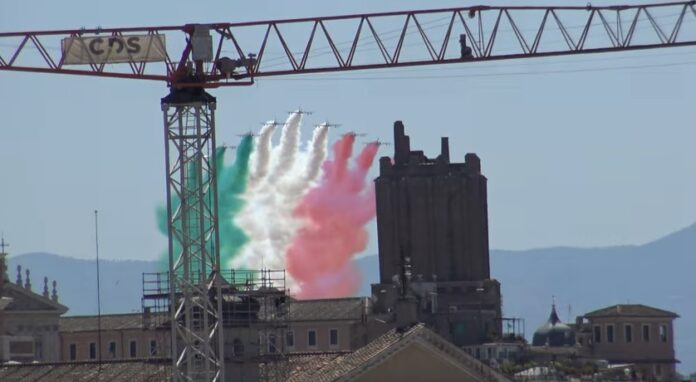 La Pattuglia Acrobatica Nazionale “Frecce Tricolori” nel cielo di Roma, in occasione delle celebrazioni del centenario dell’Aeronautica Militare e che hanno suggellato la cerimonia militare che si è svolta alla Terrazza del Pincio.