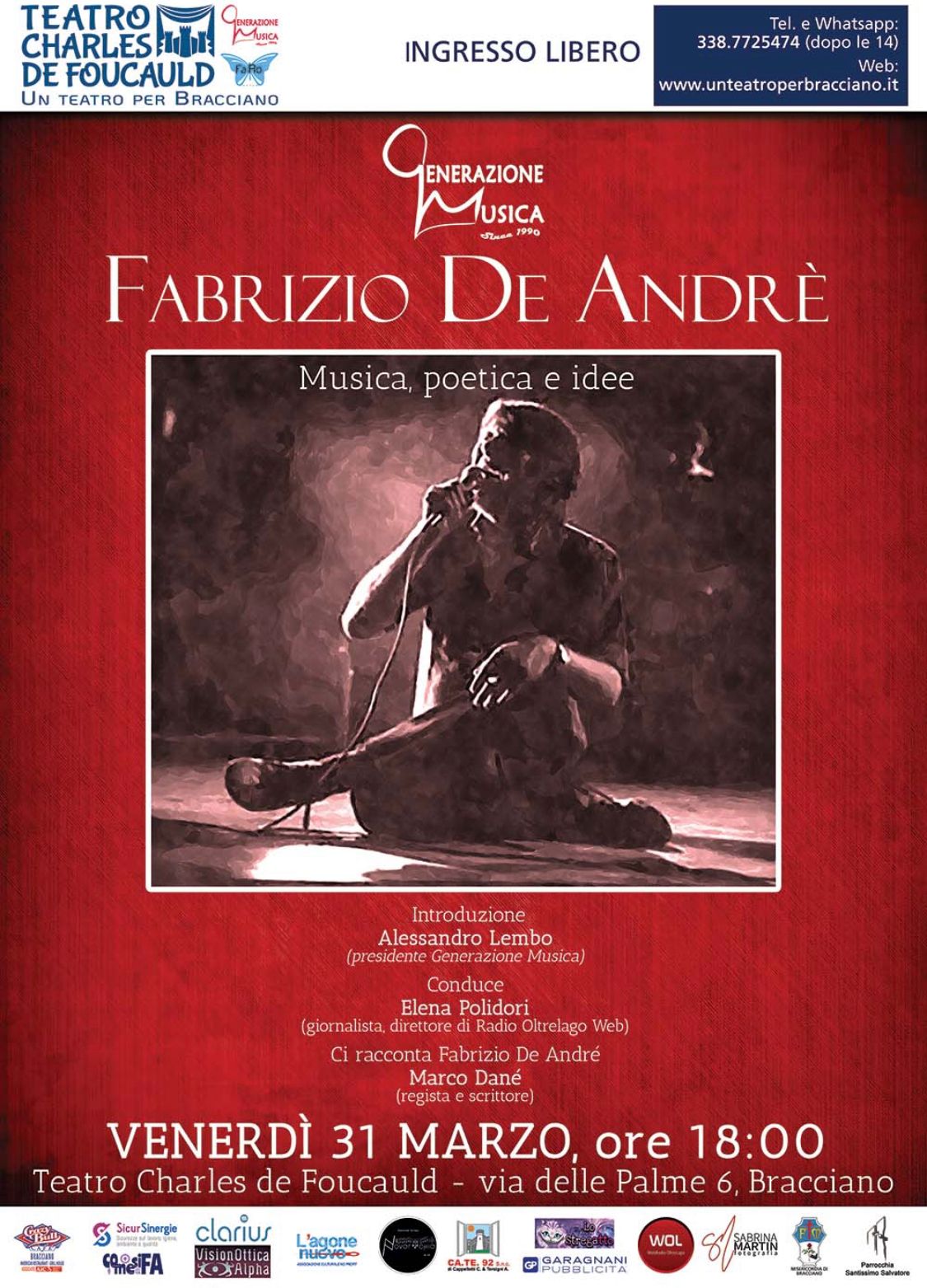 Venerdì 31 marzo, ore 18: conferenza-dibattito guidata da Marco Danè – regista, autore e conduttore di noti programmi televisivi nonché appassionato conoscitore della produzione Artistica di Fabrizio De André – per approfondire la scrittura e i temi delle canzoni del Faber attraverso l’esegesi di alcuni brani. Interventi musicali a cura di Generazione Musica, conduzione di Elena Polidori giornalista e direttore di Web Radio Oltrelago.