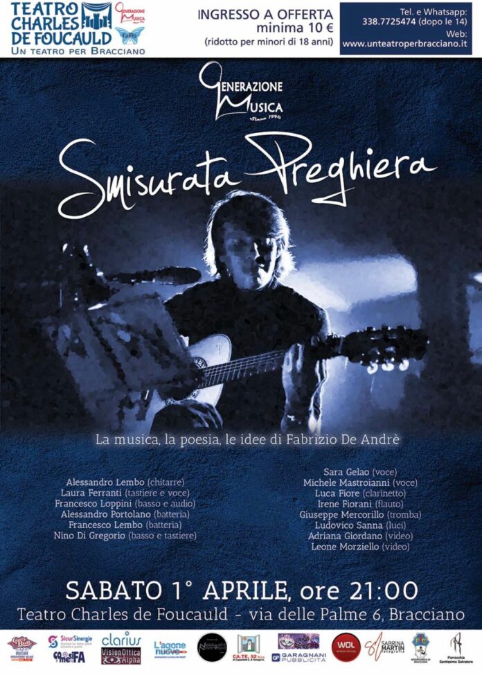 Generazione Musica presenta “Smisurata Preghiera”, concerto dedicato alla vasta produzione del cantautore genovese che, attraverso un percorso musicale con i brani più noti e cari al pubblico, vuole toccare i temi che hanno reso famoso Fabrizio De André come uno d nostri maggiori rappresentanti della musica d’autore e anche fine e attento lettore di tematiche sociali ed esistenziali del nostro tempo.
