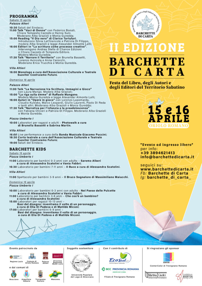 Il progetto “Barchette di carta” nasce con l’obiettivo di promuovere la Cultura e la Creatività nel territorio sabatino ponendo l’accento sulla lettura e sopportandone i numerosi autori e le piccole case editrici, veri e propri ambasciatori e testimoni delle tradizioni e dei linguaggi del territorio su cui operano.