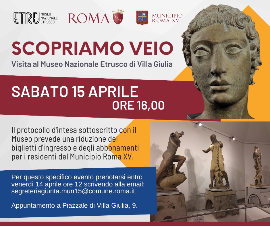 “Municipio XV e Museo Nazionale Etrusco di Villa Giulia insieme per valorizzare e far conoscere la storia del mondo etrusco e, in particolare, dell’antica città di Veio, immenso patrimonio naturale e culturale che il nostro territorio condivide con i comuni limitrofi. Dopo la firma del Protocollo d’intesa dei giorni scorsi, a partire da sabato 15 aprile, tutti i residenti del Municipio XV potranno beneficiare di riduzioni sull’acquisto del biglietto d’ingresso e delle formule di abbonamento (trimestrale, semestrale e annuale).