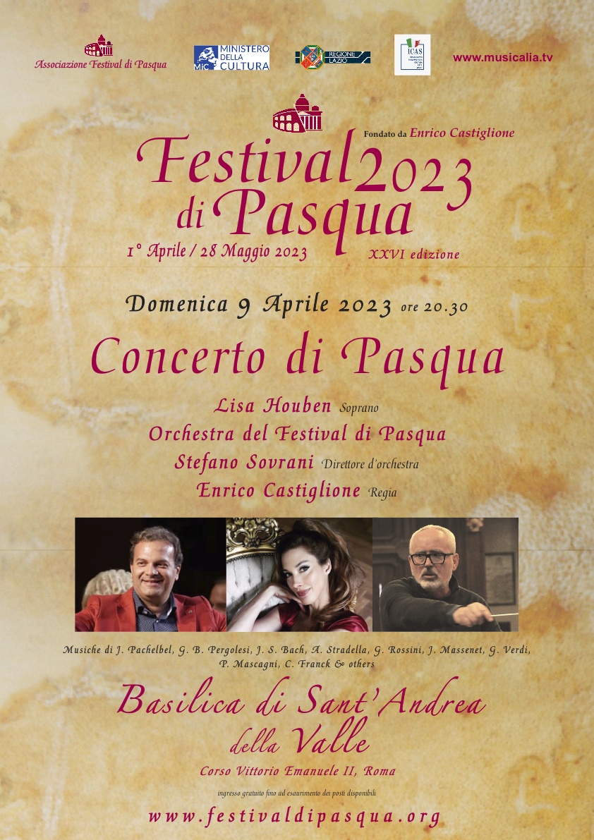 Mentre prosegue con grande partecipazione di pubblico la programmazione della XXVI edizione del Festival di Pasqua a Roma, cresce l’attesa per il tradizionale “Concerto di Pasqua” che si svolgerà a Roma nella Domenica di Pasqua, quest’anno il prossimo 9 Aprile, alle ore 20.30, nella monumentale Basilica di Sant’Andrea della Valle, con un programma di pagine di musica sacra tra le più popolari ed amate interpretate dal celebre soprano olandese di origini americane Lisa Houben, evento trasmesso dalle più importanti reti televisive internazionali e in diretta streaming con la regia di Enrico Castiglione, fondatore e gran patron della prestigiosa manifestazione.