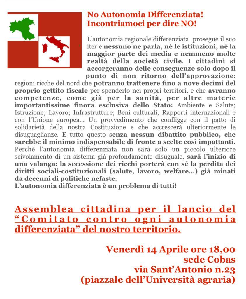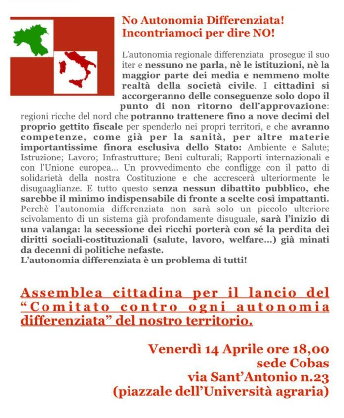Il 14 appuntamento per dire “no” all’autonomia differenziata
