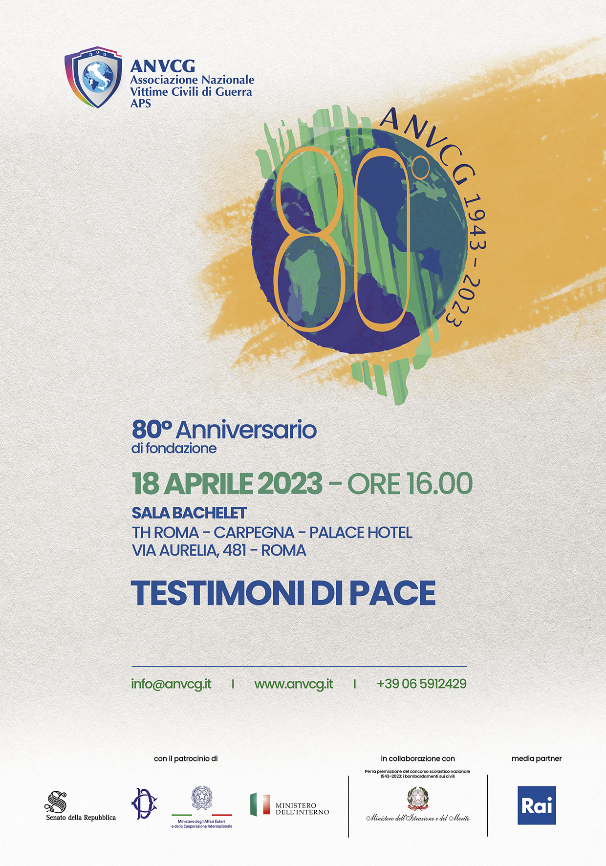L’Associazione Nazionale Vittime Civili di Guerra, l’ente morale Medaglia d’Oro al Merito Civile preposto per legge in Italia alla rappresentanza e alla tutela delle vittime civili di guerra e delle loro famiglie, celebra l’80° anniversario della sua fondazione con l’evento “Testimoni di Pace”: un’importante occasione di memoria collettiva che vuole raccontare la storia dell’Associazione attraverso le testimonianze di chi ha vissuto in prima persona le conseguenze della guerra, fino ad arrivare all’impegno odierno dell’ANVCG in favore delle vittime civili delle guerre e dei conflitti attualmente in corso nel mondo.