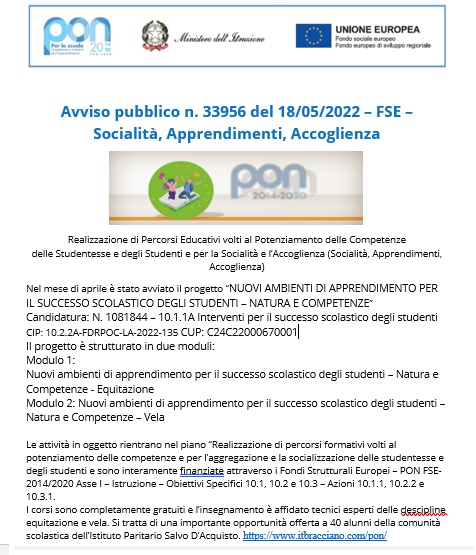 Avviso pubblico n. 33956 del 18/05/2022 – FSE – Socialità, Apprendimenti, Accoglienza