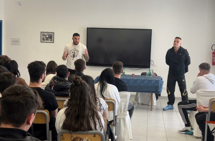 Lui è Mattia Faraoni, classe 1991, kickboxer e pugile italiano Medaglia di bronzo ai Mondiali e agli Europei di WAKO, attuale Campione mondiale kickboxing ISKA (International Sport Kickboxing Association). Si tratta, per i non esperti del settore, del famoso sport da combattimento che combina tecniche di pugilato provenienti dal karate e dalla boxe thailandese. Accanto a Mattia, dall’altra parte della cattedra, c’è Simone Cicalone, romano anch’egli, una Laurea in Cinema all’Università degli Studi “La Sapienza”, appassionato di arti marziali, youtuber ormai notissimo, straordinario narratore delle periferie della Capitale, ma non solo. L’aula è quella, familiare per il pubblico degli astanti, in cui normalmente si svolgono le tradizionali lezioni di Matematica, Inglese, Letteratura, Storia, Diritto, Scienze dell’Alimentazione, Accoglienza turistica, Pasticceria.