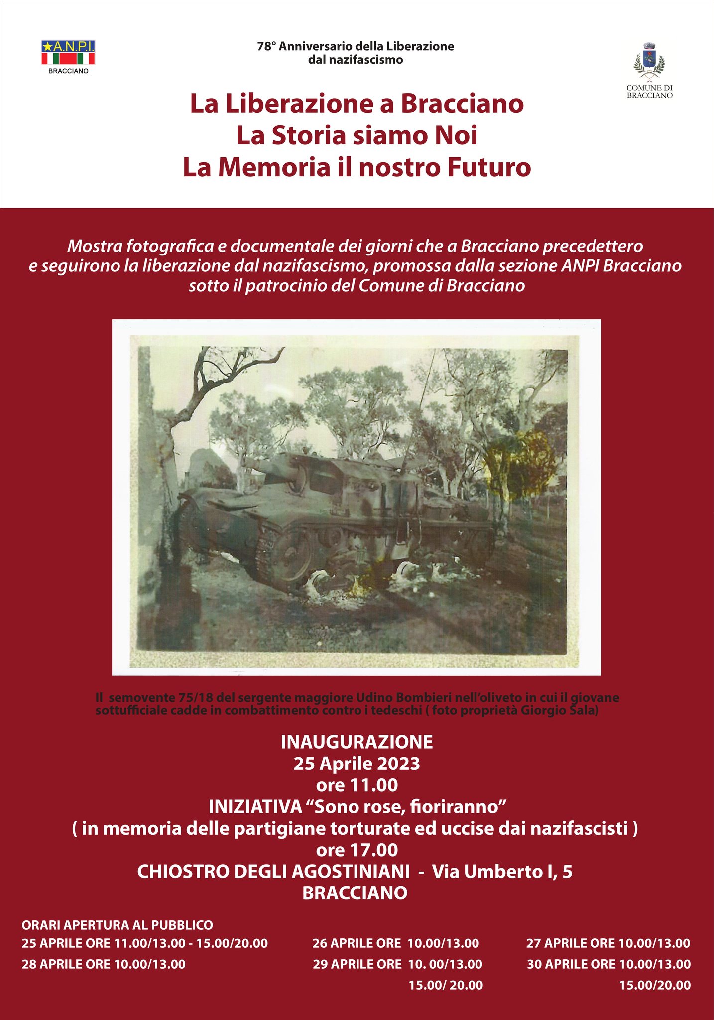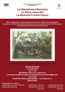 La Sezione A.N.P.I. “Antonio Quintiliani – Udino Bombieri” di Bracciano, con il patrocinio del Comune di Bracciano, ha organizzato la mostra La Storia siamo noi: la Liberazione a Bracciano. I responsabili nei mesi scorsi hanno invitato la cittadinanza a cercare ed a prestare delle fotografie che raccontassero la Bracciano del 25 Aprile 1945. Sono stati così raccolti fotografie, documenti e cimeli storici originali. In molti hanno risposto all’invito lanciato dagli organizzatori contribuendo ognuno a modo proprio a creare un’interessante iniziativa dal valore storico e culturale.