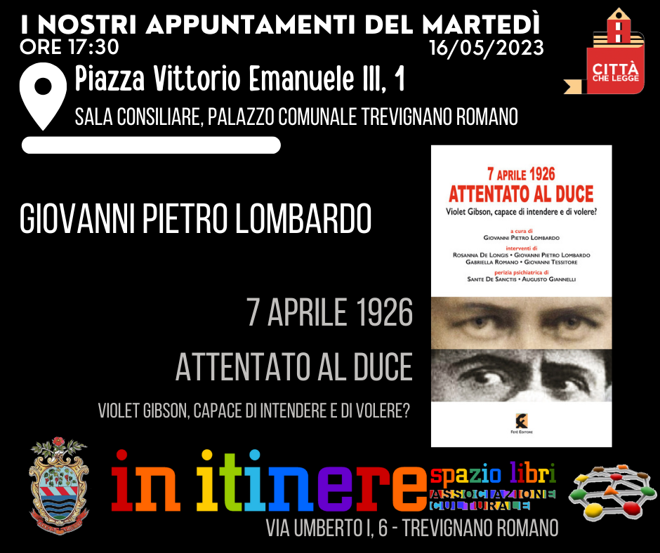 Giovanni Pietro Lombardo, con il suo libro “Aprile 1926. Attentato al Duce” racconta la storia di Violet Gibson, una donna che la famiglia e la società volle definire una pazza tirannicida irlandese, rinchiudendola in un confino definitivo. Era capace di intendere e di volere quando per pochissimo non uccise Mussolini con un colpo di pistola? A Dublino una targa commemorativa, sottolinea un nuovo pensiero, una prospettiva che vuole restituirle l’onore. Questo libro è un approccio originale, nuovo, formulato da un gruppo di persone che, per la prima volta, approfondiscono la perizia integrale della Gibson redatta da due psichiatri luminari dell’epoca. Alle 17.30 nella Sala Consiliare Palazzo Comunale.