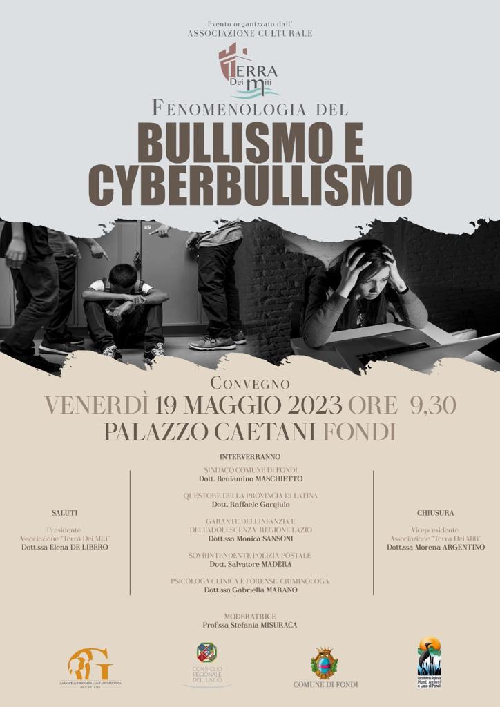 L’evento, dal titolo “Fenomenologia del bullismo e del cyberbullismo”, ha ricevuto il patrocinio del Comune di Fondi, del Parco Naturale Regionale dei Monti Ausoni e Lago di Fondi, del Garante dell’Infanzia e dell’Adolescenza della Regione Lazio e del Consiglio Regionale del Lazio.