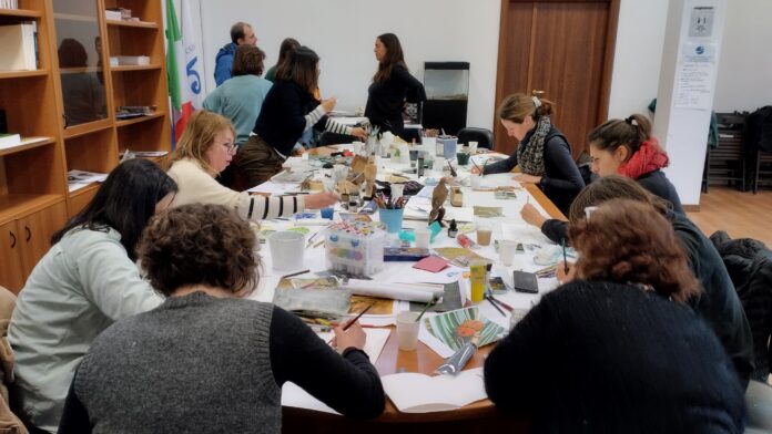 Così al gambero blu di foggia quasi marina di una artista si contrappone il gambero ritratto in rigoroso bianco e nero dell’altra. I gamberi, a questo punto, sul tavolo dove si raccolgono i disegni già completati si moltiplicano e diventano quasi una colonia. Ma a catturare l’attenzione delle valenti artiste, molte delle quali illustratrici di professione, c’è anche quello spregevole essere che è il punteruolo rosso, killer di migliaia di palme. A guardarlo con tutto quel suo colore rosso acceso, con quei rombi sul dorso e quel ridicolo punteruolo sulla punta, sembrerebbe innocuo, ma così non è. Molte palme, anche di grandi dimensioni, hanno dovuto soccombere alla loro voracità, al loro subdolo atteggiamento di celarsi nella preda che erodono. Cattivo, cattivissimo si riproduce ed uccide. Alcuni ritraggono, pennelli alla mano, anche le loro orride larve. Ma tra gli alieni riscuote ampio successo anche il parrocchetto, sia nella versione “monaca” che “del collare”. Quel verde intenso che già da sé richiama i lontani luoghi dal quale è giunto fa da straordinario attrattore per chi, come le tante attorno al tavolo, di colore vive. E così su quello stesso tavolo dei disegni già ultimato arriva quasi uno stormo di questi fastidiosi uccelli mangiafrutti. Via via che l’incontro volge al termine ecco materializzarsi sui fogli, già bianchi, a disposizione anche la tartaruga azzannatrice, lo scoiattolo, il delicato fiore giallo della pianta acquatica perenne dalle radici anfibie invasiva, la ludwigia peploide, che si sta diffondendo nei fondali del lago dopo essere arrivata in Italia per abbellire stagni ornamentali.