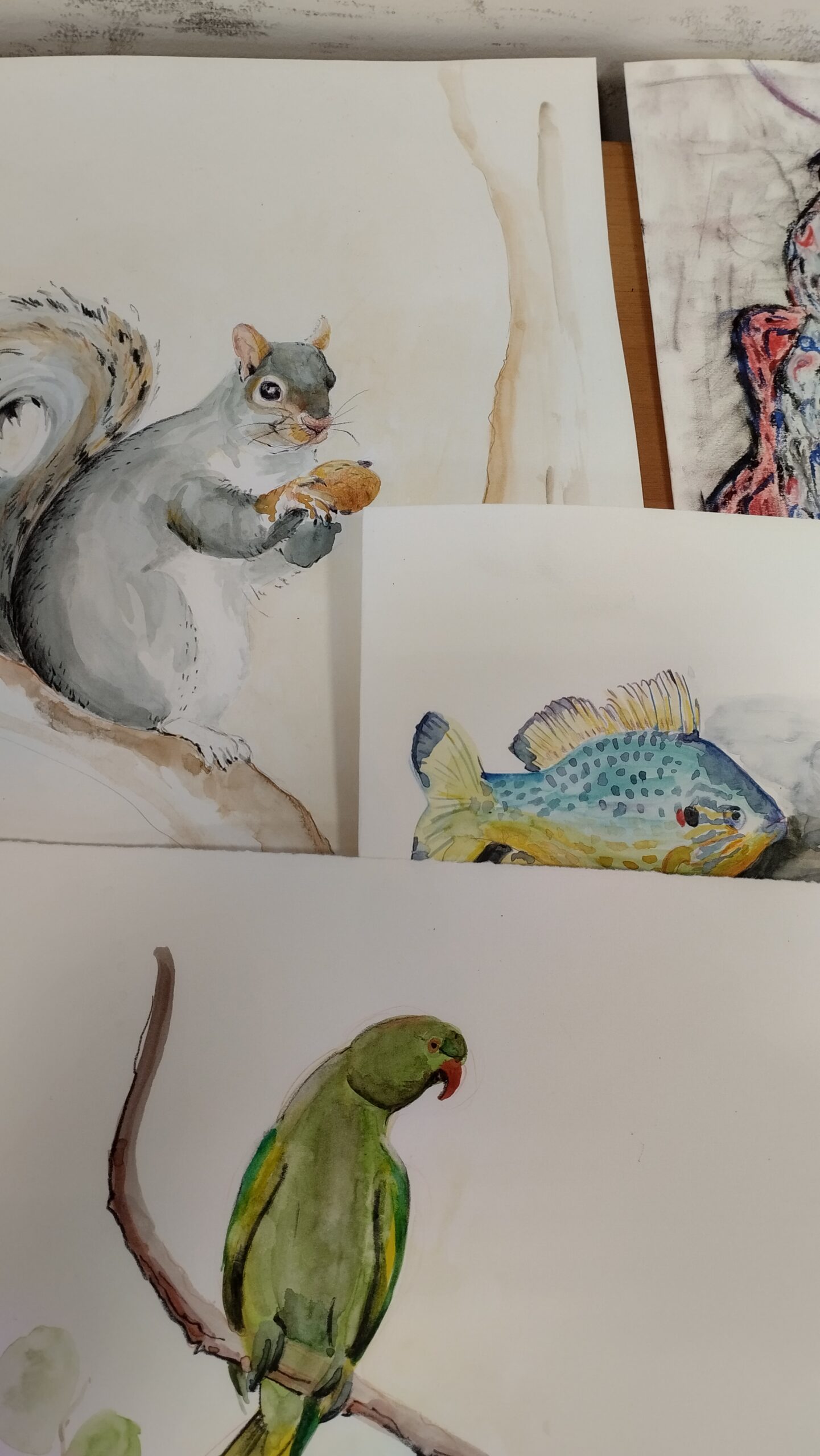 Maria Giulia ha scelto tra le specie aliene il gambero e l’ailanto. E’ rimasta soddisfatta dell’incontro con il pescatore. “E’ bello – dice – avere il tempo di fare il viaggiatore e non il turista”. Si è subito lanciata nel ritratto dello scoiattolo Misa e lo disegna e dipinge a tratto deciso. Ha al suo attivo le illustrazioni di un libro per bambini e non solo. Viene da Roma. “Ho bisogno – spiega motivando la sua scelta di figure un po’ più morbide”. E’ stato subito attratto dal punteruolo rosso invece Stefano. Di professione fa il fotografo specie naturalista. Arriva da Terracina. “Avevo una bella palma in giardino…” dice non nascondendo sommessamente tutto il rimpianto per un albero che non c’è più, soppiantato da questo insetto. Ornella, che tiene numerosi corsi di disegno e che ha inventato una speciale tecnica con la quale impiega la sabbia, ha ritratto molte delle specie aliene imputate. Elena invece, piemontese di origine e che vive oggi a Calcata per gran parte dell’incontro si è dedicata alla raffigurazione del persico sole osservandone attentamente le colorazioni tra il giallino e l’azzurrino in un mix sempre diverso. Liana invece, di là dal tavolo, ha bandito il colore e ha preferito la forma. I suoi lavori sono tutti in bianco e nero. Ha utilizzato la chine. alcune le ha gettate sul foglio e le ha sparse, altre le ha sciacquate nel lavandino. Ne sono usciti ritratti del parrocchetto, del gambero della Louisiana e di molti altri animali. DIsegna con tratto sicuro Jessica, è presidente dell’Associazione Circe che ha ideato un itinerario tra arte e natura. Per lei il blu del gambero era irresistibile e lo “ha cucinato” in vari modi, tutti egregi. Più metodica e precisa la silenziosa Flavia che nel tempo a disposizione ha ritratto la tartaruga e il suo habitat, il parrocchetto e il fiore giallo invasivo. Serena, anche, ha prodotto molto. Insegna in una delle due scuole del Lazio che può vantare una “aula natura” targata Wwf. “Da quando l’abbiamo a Santa rinella – spiega – attorno a questa aula si sviluppano molti progetti e c’è molto entusiasmo. Anche lei ha ritratto almeno tre soggetti tratti dal famigerato “catalogo” delle specie aliene. Il tempo intanto passa. E’ giunta l’ora di posare i pennelli, di svuotare i barottolini d’acqua degli acquerelli. La maggior parte dei lavori saranno esposti al pubblico. Tutto per denunciare le specie aliene. Perché se li conosci li eviti.