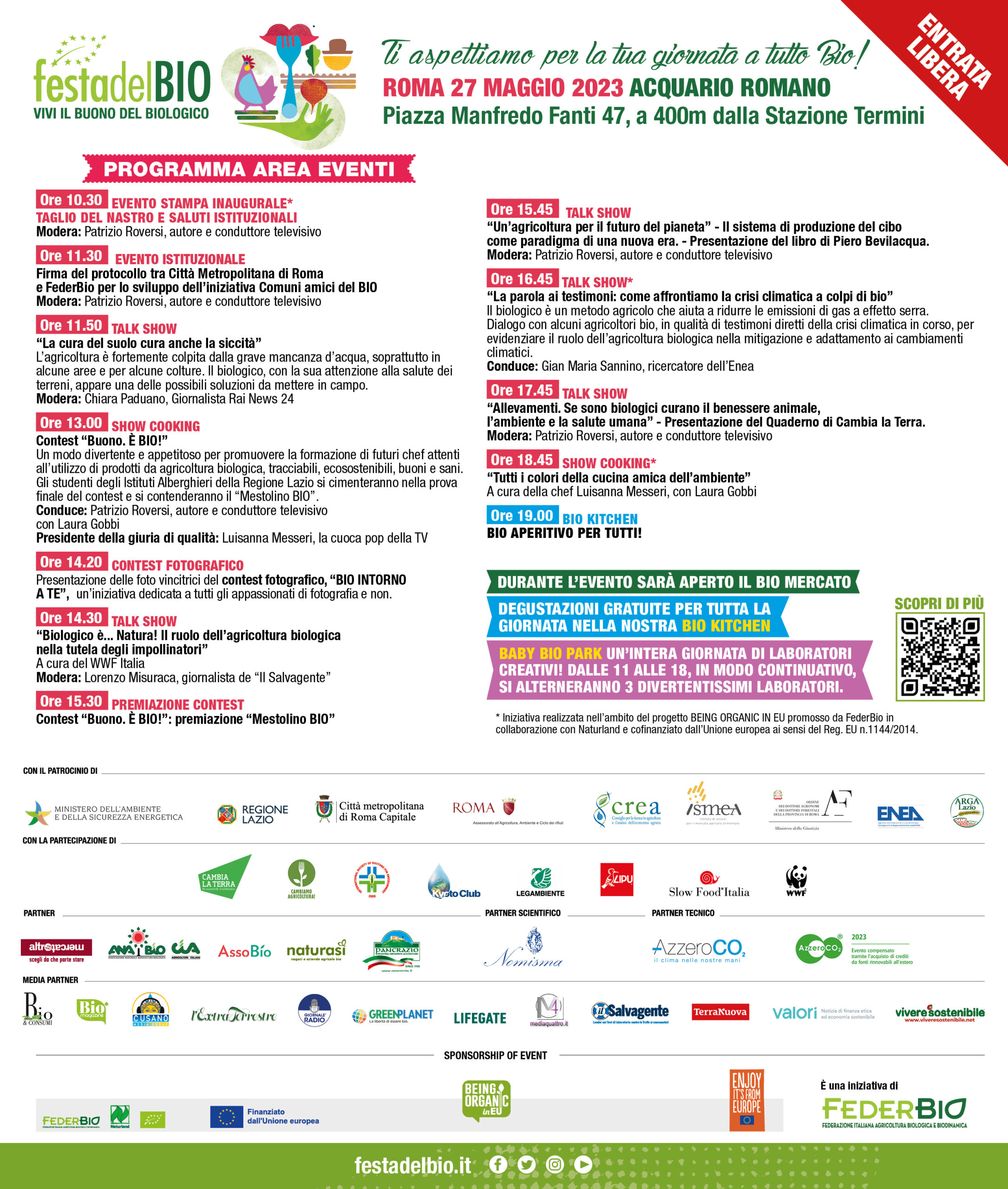Sabato 27 maggio alle 10.30 taglio del nastro inaugurale all’Acquario Romano, in piazza Manfredo Fanti 47, a pochi metri dalla stazione Termini. Saranno presenti Maria Grazia Mammuccini, Presidente FederBio, Giancarlo Righini, Assessore alle Politiche agricole del Lazio, Sabrina Alfonsi, Assessora all’agricoltura, ambiente e Ciclo dei rifiuti di Roma Capitale, Rocco Ferraro, Consigliere delegato Ambiente, Transizione ecologica di Città Metropolitana di Roma Capitale, Roberto Zanoni, Presidente AssoBio e Flavio Pezzoli, Presidente dell’Ordine dei Dottori Agronomi e Forestali di Roma e provincia.