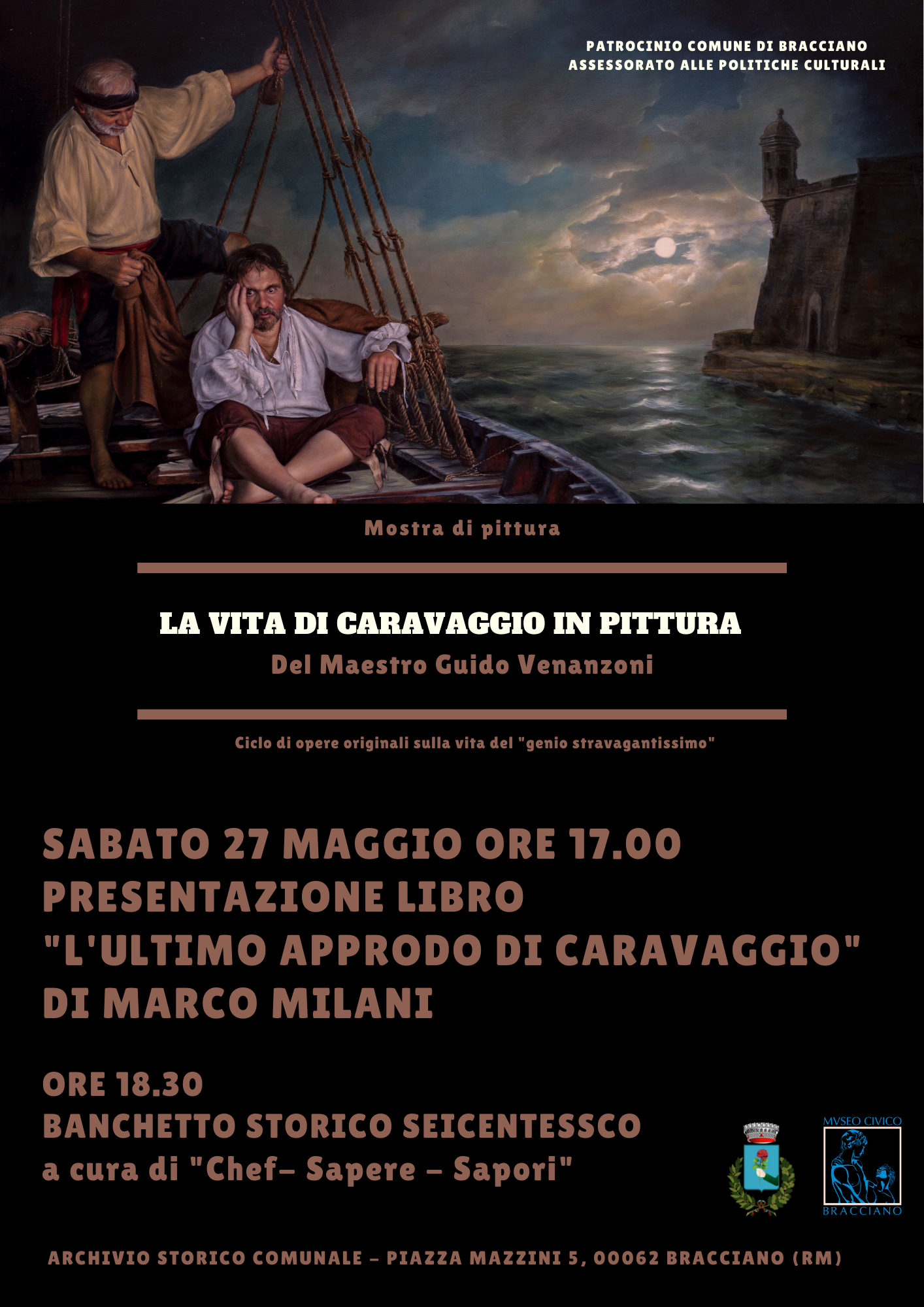 A chiusura della mostra sul Caravaggio del Maestro Venanzoni, oggi alle 17 si terrà presso la sala conferenze dell’Archivio Storico Comunale di Bracciano la presentazione del libro “L’ultimo approdo di Caravaggio” di Marco Milani, La Corte Editore. Modera l’incontro la Dott.ssa Annalisa Burattini, interverranno, oltre l’autore e curatore della mostra, lo Storico dell’Arte Arch. Cecilia Sodano e il Maestro Guido Venanzoni. Dopo quasi un mese di esposizione dei capolavori di Venanzoni, i costumi di posa de “Il salotto di Cupido” la mostra (che chiude ufficialmente domani, domenica 28 maggio), si completa con l’incontro in cui si parlerà di Caravaggio come narrato ne libro e con il succulento banchetto secentesco a cura di “Chef, Sapere-Sapori” alle 18.30.