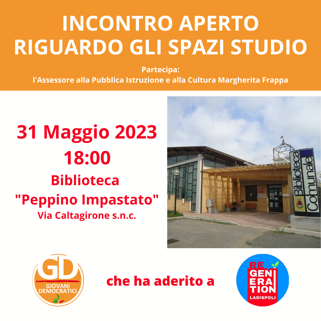 Il 31 maggio alle 18 presso la biblioteca comunale “Peppino Impastato” si terrà un incontro aperto a tutte e tutti, organizzato dal circolo “Giovani Democratici Ladispoli-Cerveteri” che di recente ha aderito a “Regeneration”, per parlare degli spazi di studio pubblici nel Comune di Ladispoli. All’incontro parteciperà anche l’Assessore alla Pubblica Istruzione e alla Cultura Margherita Frappa.