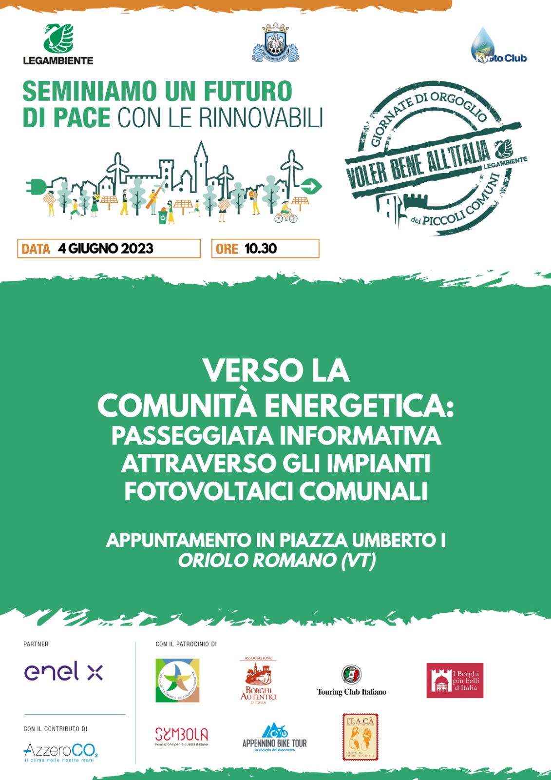 Riceviamo e pubblichiamo – Domenica 4 giugno alle 10.30 con partenza da piazza Umberto I, all’interno del programma nazionale “Voler bene all’Italia – giornate di orgoglio dei piccoli comuni” promosso da Legambiente, per promuovere il percorso verso una Comunità Energetica Rinnovabile – CER locale, svolgeremo una passeggiata divulgativa e informativa con i nostri partner tecnici per raccontare la storia degli impianti fotovoltaici comunali già esistenti e i nuovi possibili impianti che ipotizziamo di realizzare proprio per dare ulteriore slancio alla sfida della CER.