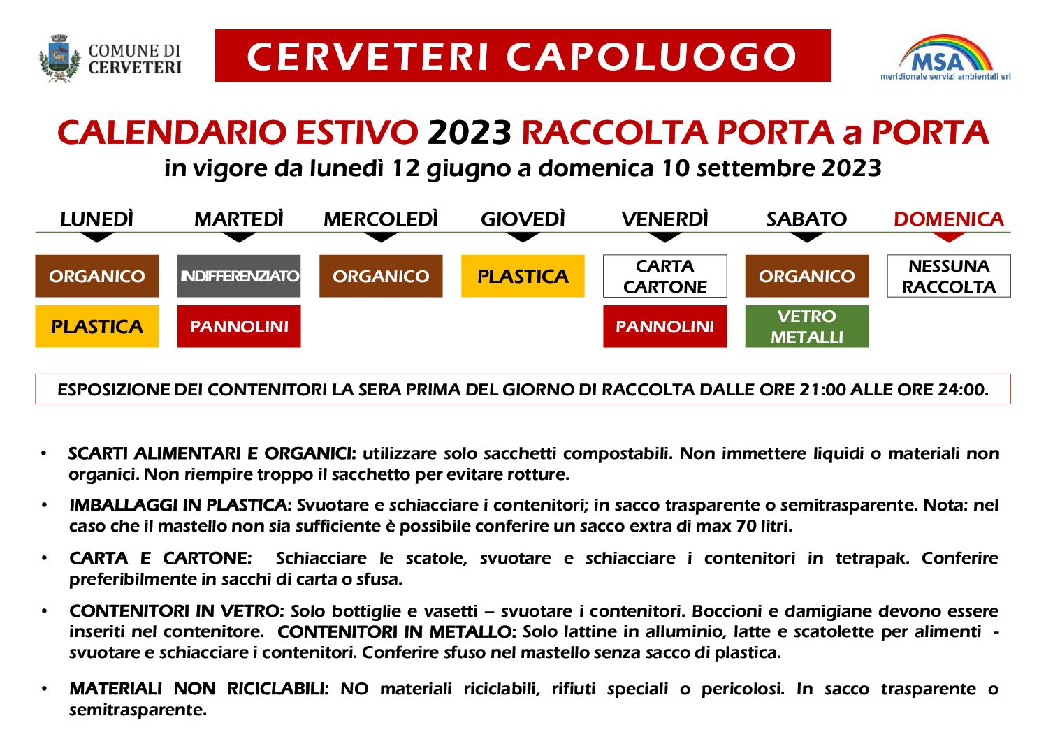 Raddoppia il ritiro della plastica e nella sola Frazione di Marina di Cerveteri, ovvero Cerenova e Campo di Mare, cambia l’orario di esposizione dei mastelli, che dovrà avvenire tra le ore 20:00 e le ore 22:00, ad eccezione del martedì, quando i mastelli di vetro e organico, andranno esposti entro e non oltre le ore 15:00. Il calendario estivo riguarda tutti i Centri Urbani, ovvero Cerveteri capoluogo, Marina di Cerveteri, Valcanneto, Borgo del Sasso, Borgo di Ceri e Cerqueto.