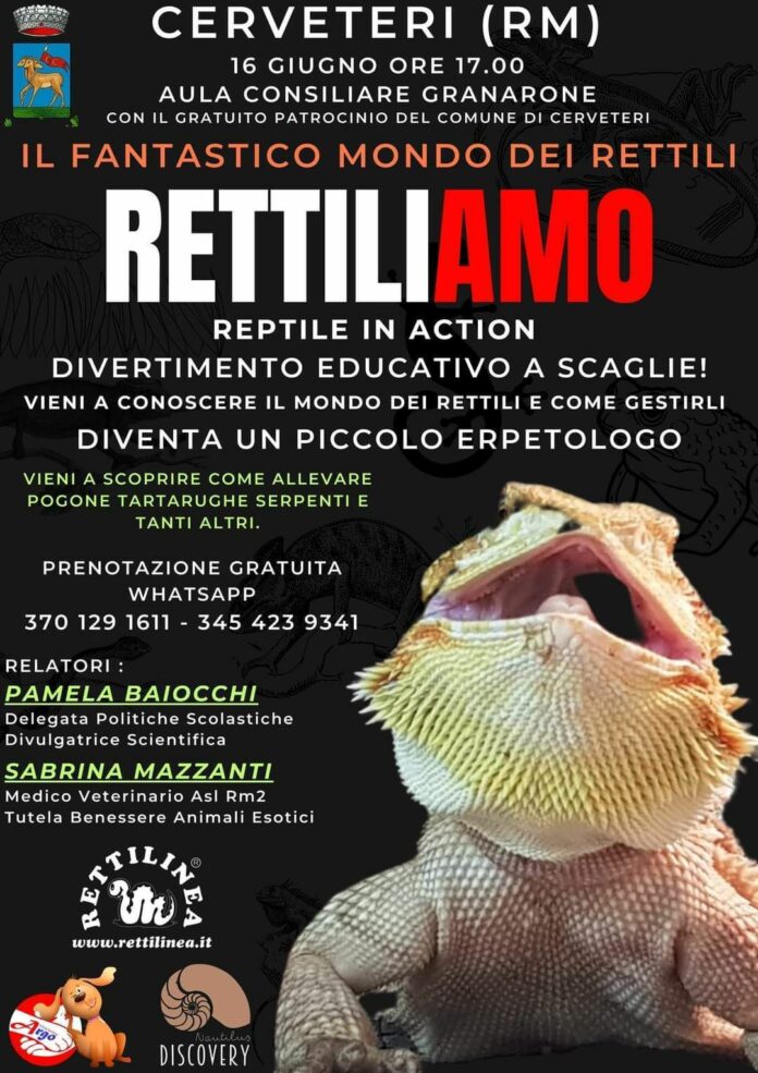 All’interno dell’Aula Consiliare del Granarone torna la divulgazione scientifica. Merito di Pamela Baiocchi, Delegata alle Politiche Scolastiche del Comune di Cerveteri e Divulgatrice Scientifica, che per venerdì 16 giugno alle ore 17:00 propone “RettiliAmo – il fantastico mondo dei rettili”, un appuntamento dedicato ai bambini e bambine, ma anche ai più grandi, per scoprire insieme il fantastico mondo dei rettili. Ad affiancare la Delegata Pamela Baiocchi, la Dottoressa Sabrina Mazzanti, Medico Veterinario della Asl Roma 2 – Tutela Benessere Animali Esotici.