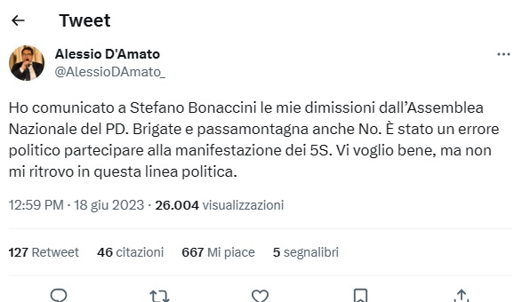 “Ho comunicato a Stefano Bonaccini le mie dimissioni dall’Assemblea Nazionale del PD”. Lo scrive su Twitter il Consigliere della Regione Lazio, Alessio D’Amato.