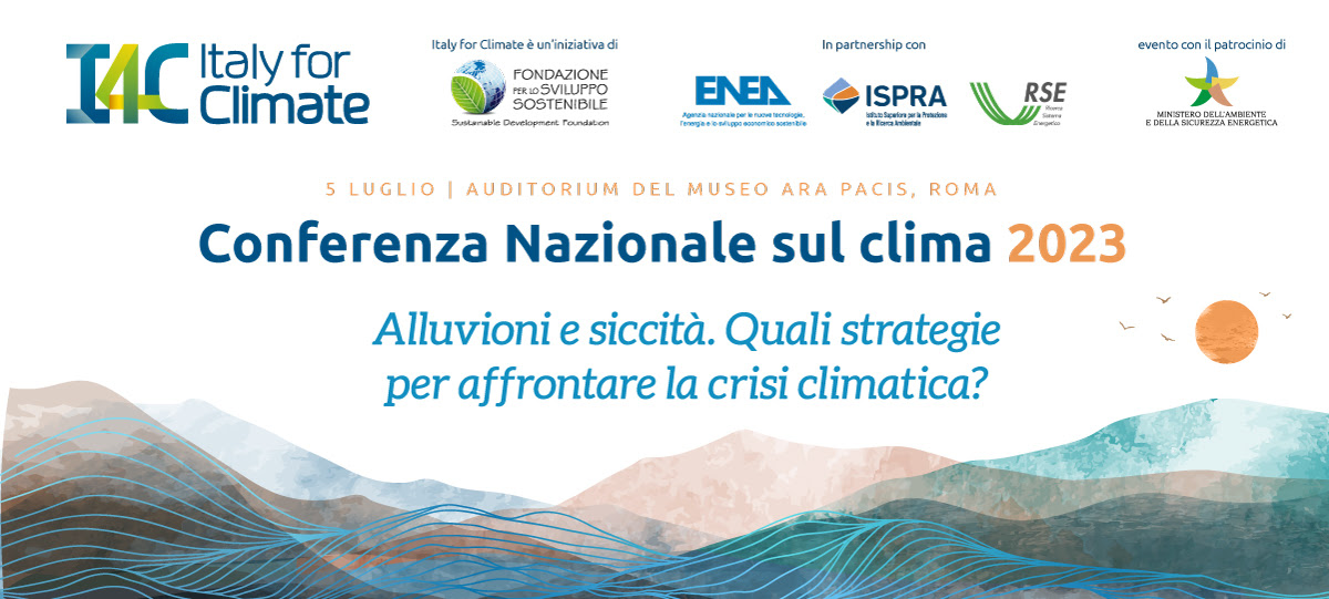 Il 5 luglio a Roma, nell’Auditorium del Museo Ara Pacis, dalle 10 alle 13 c’è la conferenza nazionale sul clima 2023, “Alluvioni e siccità. Quali strategie per affrontare la crisi climatica?” organizzata da Italy for Climate, con il patrocinio del Ministero dell’ambiente e della sicurezza energetica, che si terrà il 5 luglio a Roma, presso l’Auditorium del Museo Ara Pacis, dalle ore 10.00 alle ore 13:00.