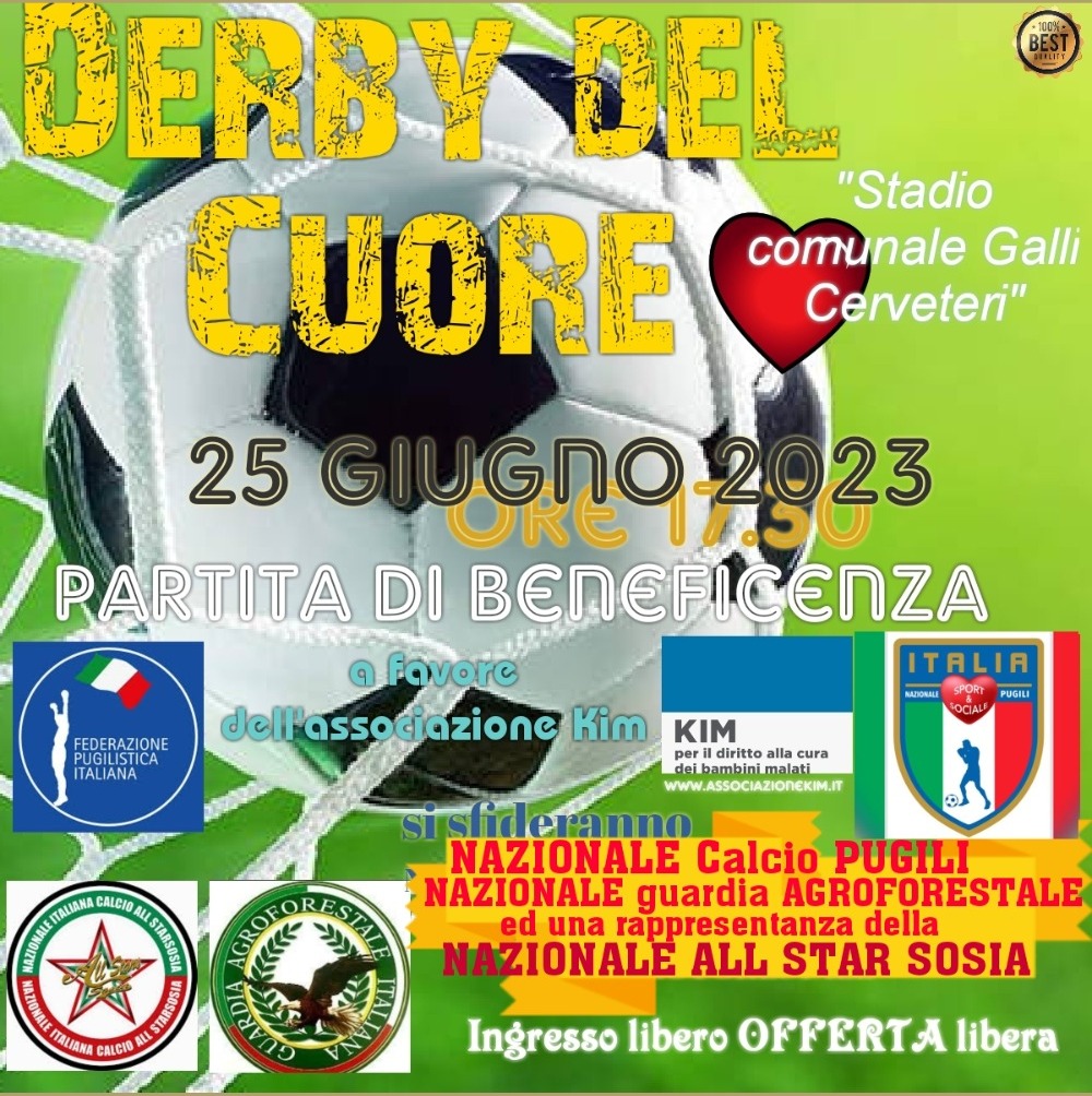 La Nazionale Italiana Calcio Pugili, la Agro Forestale e una rappresentanza della Nazionale All Star Sosia indossano pantaloncini e scarpini per i diritti alle cure dei bambini. Si svolgerà domenica 25 giugno con fischio d’inizio alle ore 17:30, presso il Campo Enrico Galli di Cerveteri, la triangolare di calcio che per un intero pomeriggio coniugherà sport e beneficienza. Un’iniziativa fortemente voluta dalla Federazione Pugilistica Italiana e ideata dal Presidente Mirko Parisi e organizzata da Luisiano Fiore, direttore sportivo della Federazione che per l’occasione indosserà i guantoni da portiere, che ha goduto dell’immediata disponibilità dei gestori del campo Galli, la Famiglia Lupi. Ingresso con offerta libera. Tutto il ricavato sarà devoluto all’Associazione KIM.