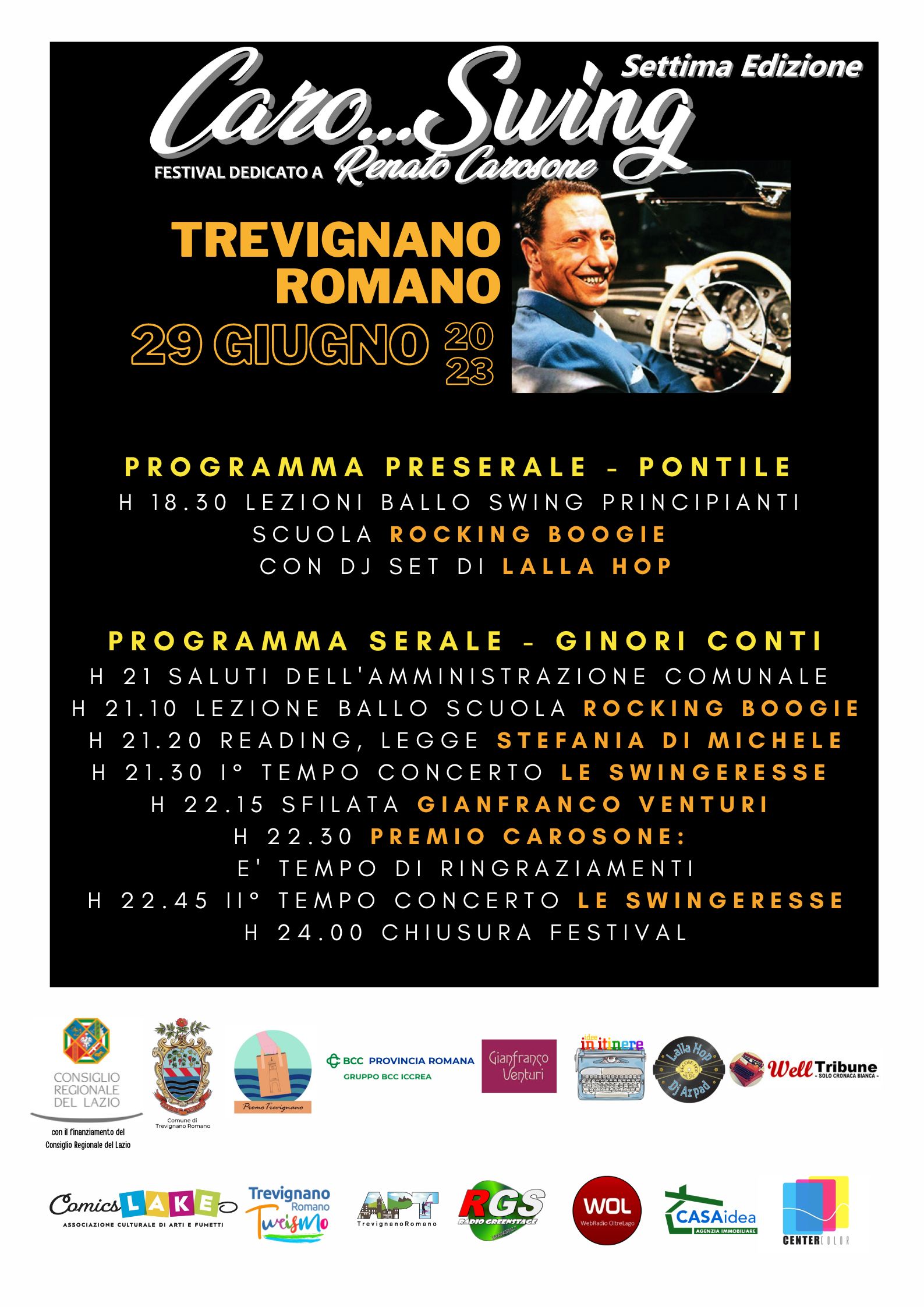 “Caro… Swing”, nato da un idea della giornalista M. Vittoria De Matteis, si avvale di una collaborazione plurale, con Gianfranco Venturi, l’associazione culturale In Itinere e – da questa edizione – ComicsLake. Con il patrocinio del Comune di Trevignano Romano ed il finanziamento del Consiglio Regionale del Lazio , presente come sempre, la famiglia del M° Carosone.