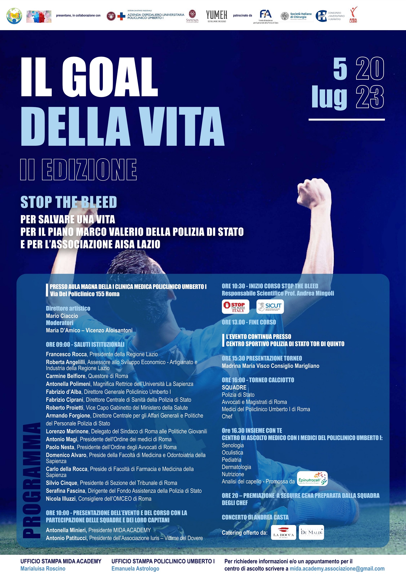 Mercoledì 5 luglio torna a Roma la seconda edizione de “Il Goal della Vita”. L’iniziativa, promossa dall’Associazione Mida Academy e dall’Associazione IURIS Vittime del Dovere della Polizia di Stato, in collaborazione con il Policlinico Umberto I e l’Università di Roma La Sapienza e patrocinata dall’IDI IRCSS Istituto Dermopatico dell’Immacolata e dal Comune di Roma. L’iniziativa ha quest’anno come slogan “Nessuno deve morire per una emorragia non controllata”.