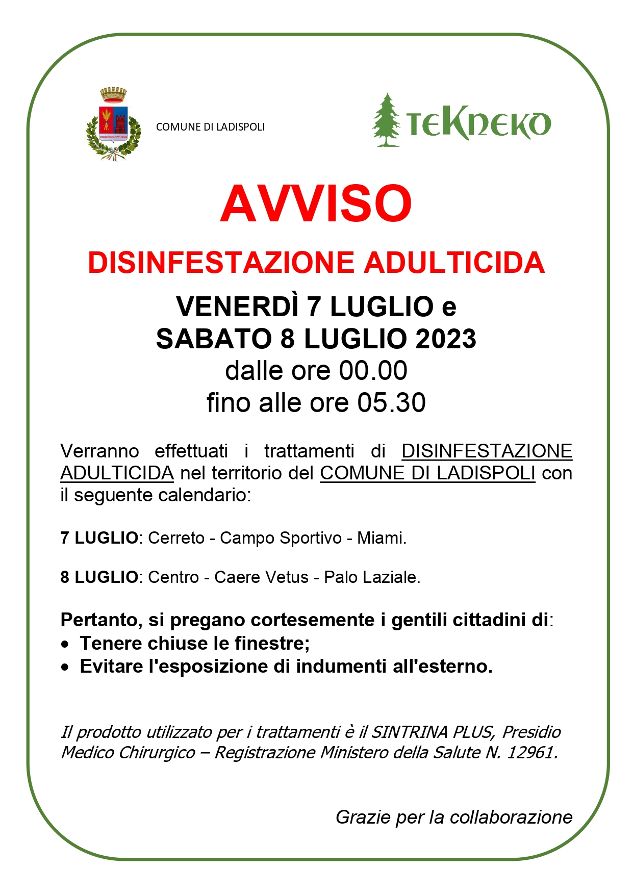 Riceviamo e pubblichiamo – L’Amministrazione comunale rende noto che venerdì 7 e sabato 8 luglio si terrà secondo intervento di disinfestazione adulticida dalle zanzare nel territorio di Ladispoli.