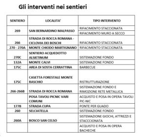 L’azione più significativa è stata progettata in località San Bernardino Malpasso per il sentiero 269 che, con un suggestivo affaccio sul golfo trevignanese, unisce le province di Roma e Viterbo collegando Trevignano Romano a Monterosi: oltre centocinquantamila euro sono stati stanziati per il rifacimento del muro a secco e della staccionata maremmana, compresa la pulizia perimetrale e la demolizione dei tratti di muro in pietra ammalorati.