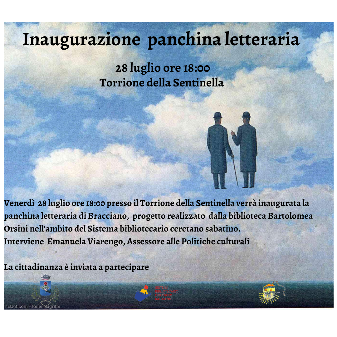 Proprio come tante importanti città italiane ed europee anche Bracciano, città prolifera di anime artistiche e letterarie ha ora la sua “Panchina Letteraria”, che il prossimo venerdì 28 luglio alle ore 18.00 sarà ufficialmente inaugurata. La Panchina Letteraria di Bracciano è arrivata a destinazione scortata a lampeggianti accesi, come si conviene ad un carico speciale, dalla volante del Comandante della Polizia Locale di Bracciano Claudio Pierangelini, lo scorso venerdì 21 luglio. Passando a stento nella stretta via della Arazzaria l’opera è così stata posta nella sua sede di collocazione, l’affaccio sul lago, del Torrione della Sentinella, dove presto farà bella mostra di sé. Il progetto è stato realizzato dalla Biblioteca Bartolomea Orsini di Bracciano nell’ambito del Sistema Bibliotecario Ceretano Sabatino. Proprio la bibliotecaria Ilaria Luongo ha spiegato che: “La panchina rappresenta un invito al volersi fermare e lasciarsi catturare dalla magia delle parole, immergendosi nella lettura in un contesto incantato come è quello scelto, il Torrione della Sentinella, probabilmente è uno dei luoghi più suggestivi del nostro paese. L’obiettivo è rendere gli spazi pubblici sempre più fruibili e sempre più luoghi di diffusione della cultura e quindi della lettura”. La Panchina Letteraria è una vera e propria installazione artistica a forma di libro aperto che riporta spesso frasi di autori e libri famosi, su immagini artistiche. “L’immagine scelta per lo schienale della nostra panchina – racconta Luongo – “infinito riconoscimento di Magritte” è un invito a far volare i nostri pensieri, aprire le famose finestre verso nuovi mondi; nelle giornate limpide il cielo dell’opera si confonde con il cielo sovrastante. La frase scelta è di Calvino sia per omaggiarlo per la ricorrenza del centenario dalla sua nascita e sia perché calzante con la mission propria della biblioteca, diffusione di una lettura condivisa ed inclusiva: “leggere è andare incontro a qualcosa che sta per essere e ancora nessuno sa cosa sarà”. In Italia la prima città ad avere la sua panchina letteraria è stata Foggia e da lì si sono diffuse in Molise, in Sicilia a Terrasini, dedicate tra gli altri a Sciascia e Camilleri. Un invito alla lettura artistico e originale importato dall’Inghilterra, proprio qui a Londra dal 2014 nella città sono state installate ben 50 “Panchine della Lettura”.