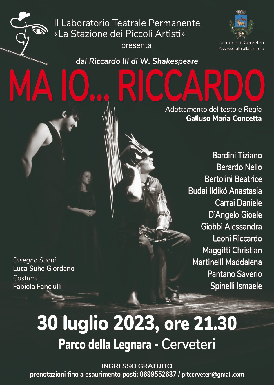 William Shakespeare rivive al Parco della Legnara insieme al Laboratorio Teatrale Permanente della Stazione dei Piccoli Artisti. Domenica 30 luglio alle ore 21:30, l’Estate Caerite 2023 propone “Ma io… Riccardo”, liberamente tratto dal “Riccardo III” di Shakespeare, per l’occasione riadattato sotto la regia di Maria Concetta Galluso.