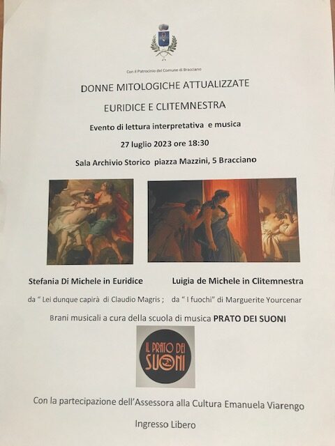 Nella sala dell’Archivio Storico di Bracciano, il 27 luglio, due eccellenti lettrici – Stefania Di Michele e Luigia de Michele – diverse per formazione e provenienza, ma forse con un avo in comune di nome “Michele”, si sono incontrate per la prima volta su un palco. Introdotte sapientemente dall’assessore alla Cultura – Emanuela Viarengo – esse hanno magistralmente catturato l’attenzione del pubblico, alternandosi nell’interpretare due grandi figure mitologiche, Euridice e Clitemnestra, entrambe morte per troppo amore. Stefania di Michele ha dato voce ad Euridice, ne ha attualizzato la figura interpretando un brano di Claudio Magris, “Lei dunque capirà”, in cui, contrariamente al mito, Orfeo dà spazio alle parole dell’amata ninfa Euridice, morta per il morso di una vipera e relegata per sempre nel regno dei morti.