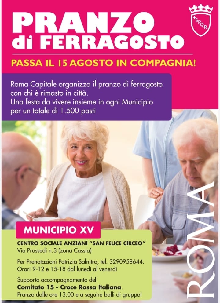 Organizzato anche quest’anno in collaborazione con il Comitato Municipio 15 della Croce Rossa Italiana, che ringraziamo per essere sempre al fianco dei più fragili del nostro territorio, il Pranzo di Ferragosto del Municipio XV si svolgerà a partire dalle ore 13 al Centro Anziani San Felice Circeo di Via Prossedi 3, zona Cassia. A seguire balli di gruppo e attività per passare il pomeriggio in compagnia.