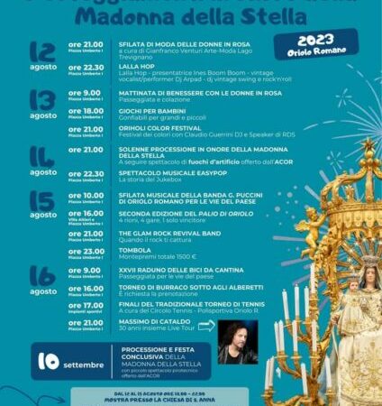 Entrano nel vivo, a Oriolo Romano, i festeggiamenti in onore della “Madonna della Stella”. Dal 12 al 16 agosto sarà il momento della festa principale di “Oriolo: un borgo all’aperto” che da sempre unisce tradizione e innovazione e che porta tutta la comunità a ritrovarsi a celebrare i propri riti e la secolare devozione alla “Madonna della Stella”.