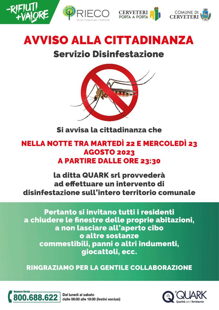 Il Comune di Cerveteri ha programmato un nuovo intervento di disinfestazione anti-zanzare in tutto il territorio comunale. Ad effettuarlo, la ditta Quark srl, che nella notte tra martedì 22 e mercoledì 23 agosto provvederà ad effettuare un interventi nell’intero territorio comunale. Il trattamento avrà inizio alle ore 23:30 e si concluderà alle prime ore del mattino seguente.