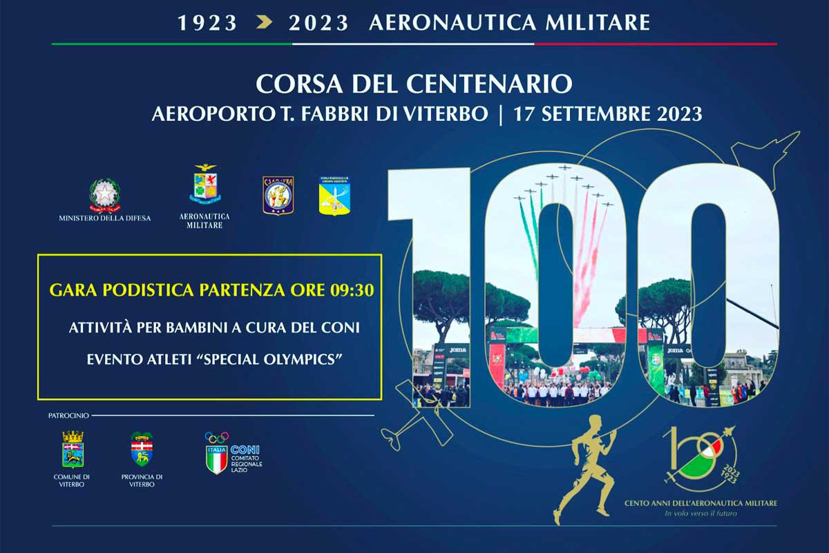 L’aeronautica militare in occasione del centenario il 17 settembre celebrerà con la “Corsa del centenario”. L’evento, incentrato sullo sport e sui valori della solidarietà e della beneficenza (il ricavato sarà devoluto all’iniziativa “un dono dal cielo per l’Associazione italiana per la ricerca sul cancro” e ad altre associazioni di volontariato del territorio), si svolgerà nella scuola marescialli dell’aeronautica militare. La scuola marescialli dell’aeronautica militare, comando aeroporto di Viterbo, in collaborazione con l’Asd Runnner team di Viterbo organizza infatti una gara podistica di 10 chilometri competitiva con partenza alle 9,30, attività per bambini in collaborazione con il Coni dalle 9,35, Special Olimpics con dimostrazione sportiva dalle 11,15.
