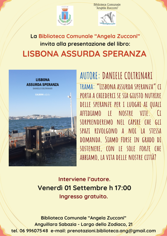 Venerdi primo settembre alle 17alla biblioteca comunale “Angela Zucconi” presentazione del romanzo “Lisbona assurda speranza”, scritto dall’autore Daniele Coltrinari nella sua nuovissima edizione.