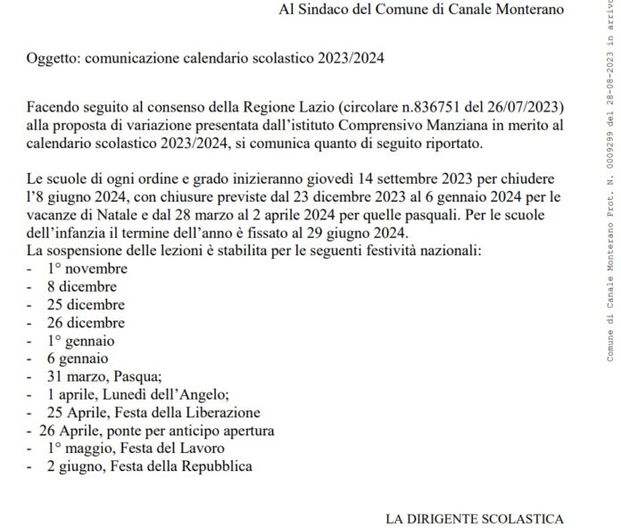 Scuola, Canale Monterano dirama il calendario dell’anno che sta per cominciare
