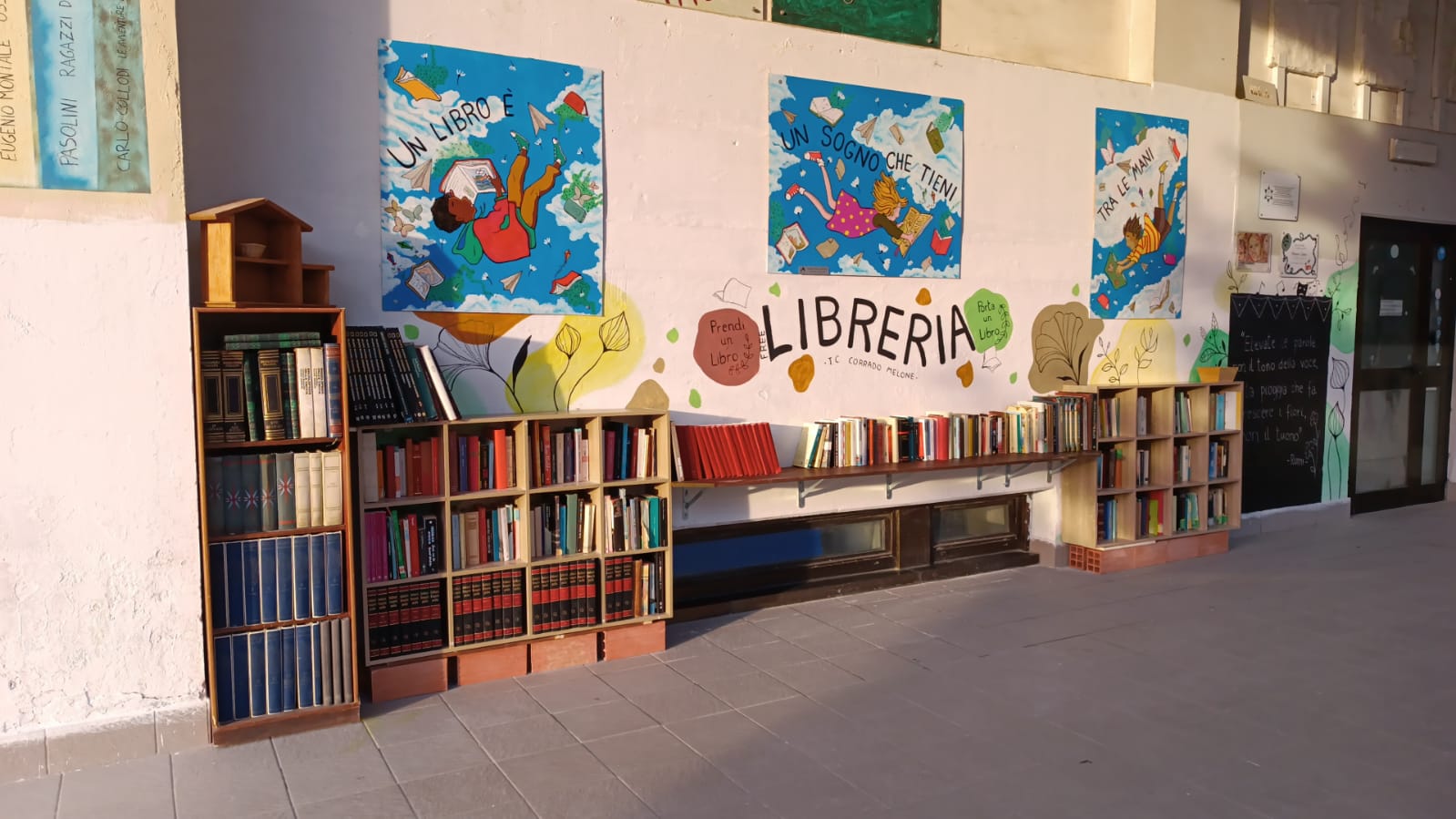 Ma un ambiente grigio e noioso non stimola la fantasia e la gioia, per cui proseguiranno le attività decorative delle aule, con l’aiuto dei genitori che vogliano mettersi in gioco con le classi dei propri figli, ma anche gli spazi comuni saranno resi più belli. Dopo il posizionamento della scultura “1022” di Fabrizio Pompili e di un salvagente proveniente da Lampedusa (donato dalla Caritas) che invita con il suo esempio a salvare vite umane, le decorazioni di Sonia Perticara, i personaggi disneyani delle pareti interne viciniori alle aule dei più piccoli (opere di Caterina Farina), la presenza nelle aule di dipinti di Guido Venanzoni, l’esposizione delle splendide tele descriventi il mare donate da Anna Tonelli ed i murales di Vincenza Conti, Nadia Cesarini, Monica Marra, Tiziana Rinaldi Giacometti, Daniele Bartocci, Carlo Gori, Burla Manu, Mosa One, Andrea Puca, Antonella Pirozzi, C0110, Lac68, Dreamplus, Uman, sarà la volta di un altro famoso street artist, Maupal, che realizzerà un murale alto oltre 15 metri all’interno della Scuola, grazie al fondamentale supporto economico di Luca Quintavalle. Tuttavia già chi entra dall’ingresso principale della Scuola può vedere il lavoro della famiglia Ferri-Perticara che ha organizzato l’accoglienza dei “libri da rubare”: una biblioteca “aperta” dove possono essere prelevati gratuitamente (o anche donati) libri per i ragazzi ed i loro genitori, come invito fattivo alla lettura.