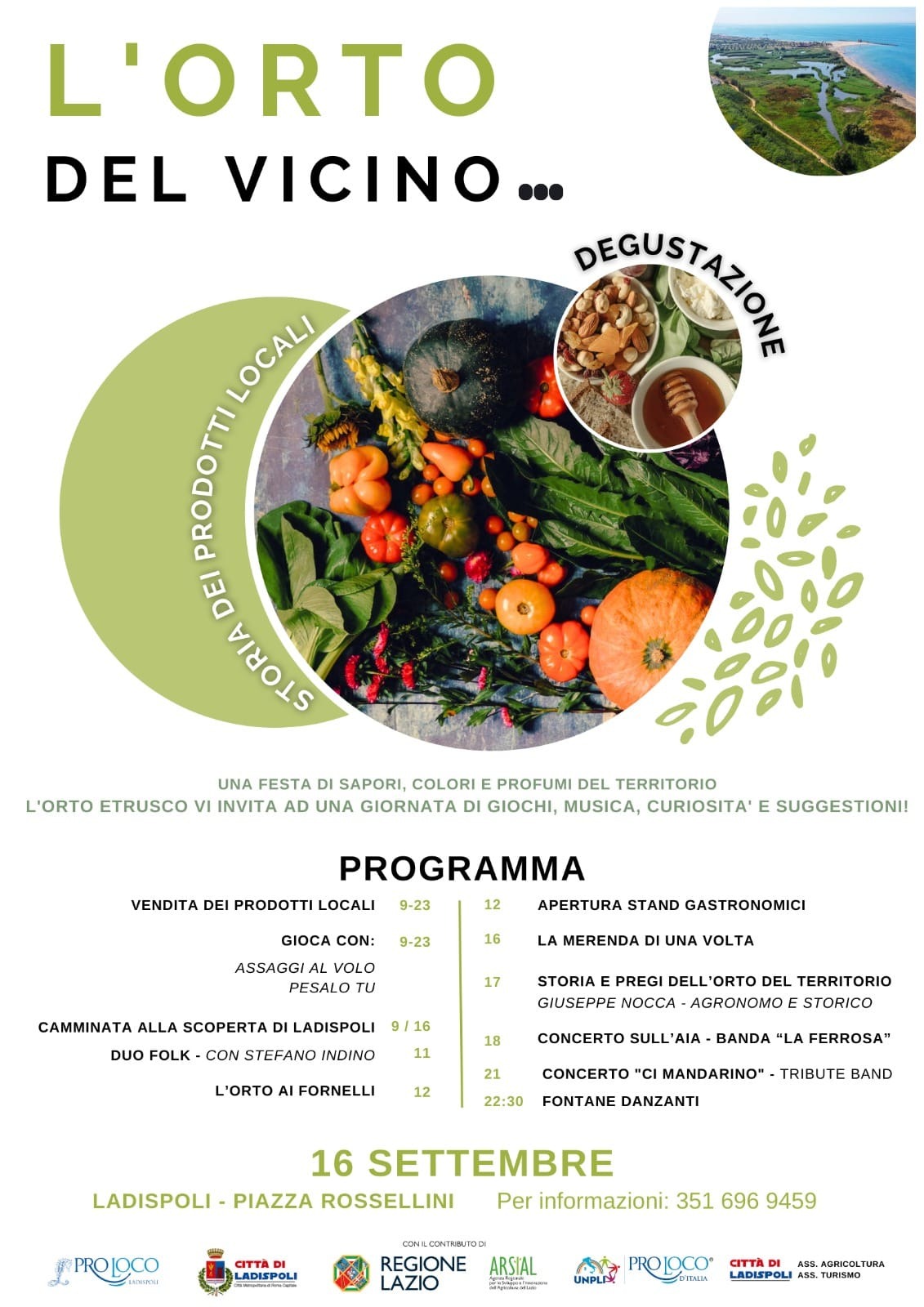 Una festa di sapori, colori e profumi del territorio, tra giochi, divulgazione, storia dei prodotti locali, musica, degustazioni e “fontane danzanti”. Tutto questo è “L’orto del vicino”, organizzato da Pro Loco Ladispoli e UNPLI Lazio e patrocinato da Comune di Ladispoli, Regione Lazio, ARSIAL e Assessorati all’Agricoltura e al Turismo del Comune di Ladispoli, che si terrà il 16 settembre in piazza Rossellini.