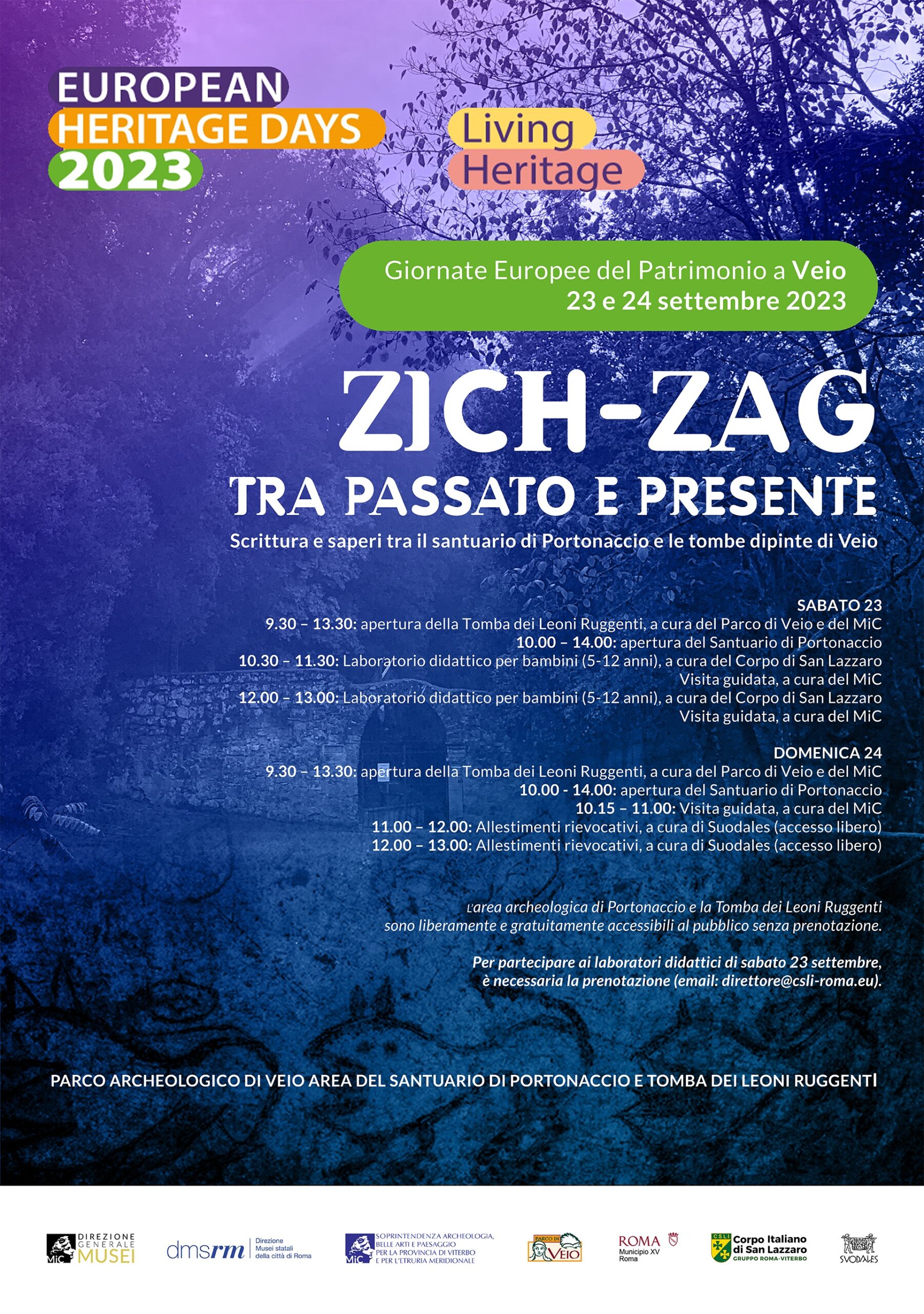 Due giornate ricche di appuntamenti e visite gratuite nel Parco di Veio a cura della Direzione Generale Musei, Direzione Musei Statali della Città di Roma, Soprintendenza Archeologica, Belle Arti e Paesaggio per la Provincia di Viterbo ed Etruria Meridionale, Municipio XV di Roma, Ente Regionale Parco di Veio, Corpo Italiano di San Lazzaro – Gruppo Roma Viterbo e Suodales – Associazione di rievocazione storica etrusca e romana.