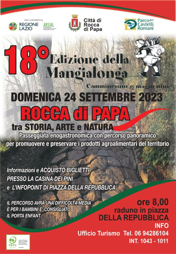 Torna a Rocca di Papa la Mangialonga. La tradizionale passeggiata enogastronomica con percorso panoramico per promuovere e preservare i prodotti agroalimentari del territorio, giunta alla sua 18ma edizione, si terrà domenica 24 settembre, con partenza alle ore 8:00 da Piazza della Repubblica, per concludersi nel pomeriggio a Piazza Giuseppe Di Vittorio ai Campi di Annibale..