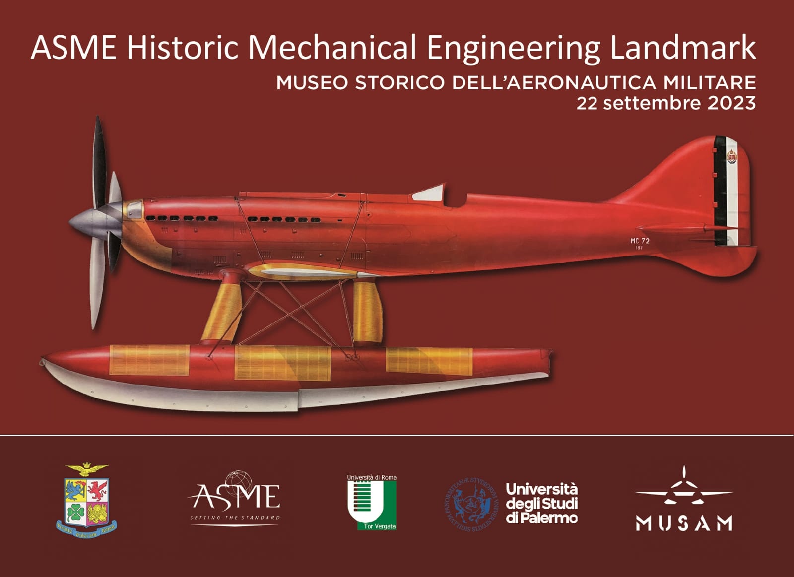 L’ASME (American Society of Mechanical Engineers) è un’associazione americana di stampo ingegneristico fondata nel 1880 che conta migliaia di soci in tutto il mondo, tra ingegneri, professionisti, ricercatori e imprenditori. Conosciuta per le sue norme e standard, ASME conduce una delle maggiori operazioni di pubblicazioni tecniche al mondo, organizza numerose conferenze tecniche e centinaia di corsi di sviluppo professionale ogni anno, oltre a sponsorizzare numerosi programmi di educazione e ad assegnare diversi riconoscimenti annuali, tra cui il premio ASME appena ricevuto dal Macchi MC-72. Dal 1971 ad oggi l’ASME ha assegnato 280 landmark in tutto il mondo, di cui 18 in Europa e solo due in Italia: il primo, conferito nel 2017 alla intera collezione del Museo Storico dei Motori e dei Meccanismi dell’Università di Palermo, il secondo proprio all’MC-72 del MUSAM.