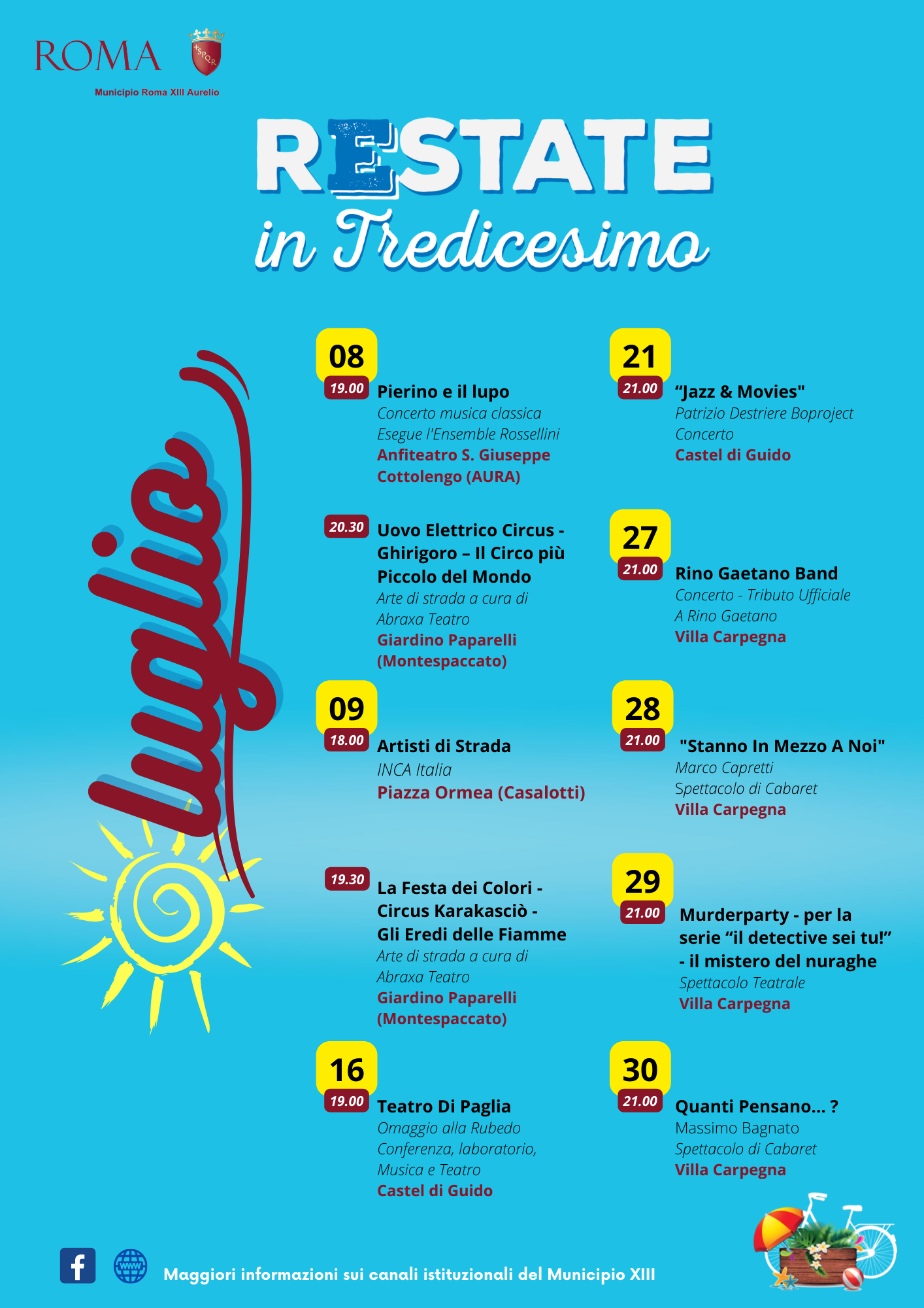 Venerdì 8 luglio prenderà il via nel XIII Municipio di Roma il programma di “Re…state in tredicesimo. Previste nel corso del mese di luglio numerose attività culturali, spettacoli e concerti, che vedranno protagonisti artisti come la Rino Gaetano Bando e il comico Massimo Bagnato.