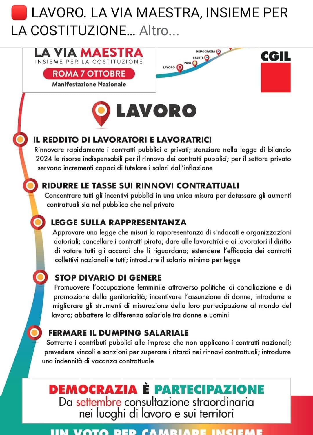 «Dobbiamo riaffermare un punto, chi produce la ricchezza di un Paese è chi lavora, non è la finanza e per questo la ricchezza prodotta da chi lavora deve tornare a chi lavora. Non si può essere poveri lavorando, non è un lusso è un diritto, è la democrazia, è la libertà». Oltre a questo Landini ha inoltre posto l’attenzione alle morti sul lavoro, dichiarando che 80 morti al mese, sono una strage ed è definito poi “inaccettabile” il taglio della spesa sanitaria inserito nella nota di aggiornamento al documento di economia e finanza (Nadef). Ha ricordato inoltre il tema dell’alluvione in Emilia-Romagna «sono passati mesi, gli unici soldi che gli alluvionati hanno visto sono quelli dei Comuni e delle Regioni, dallo Stato non hanno ancora visto un euro».